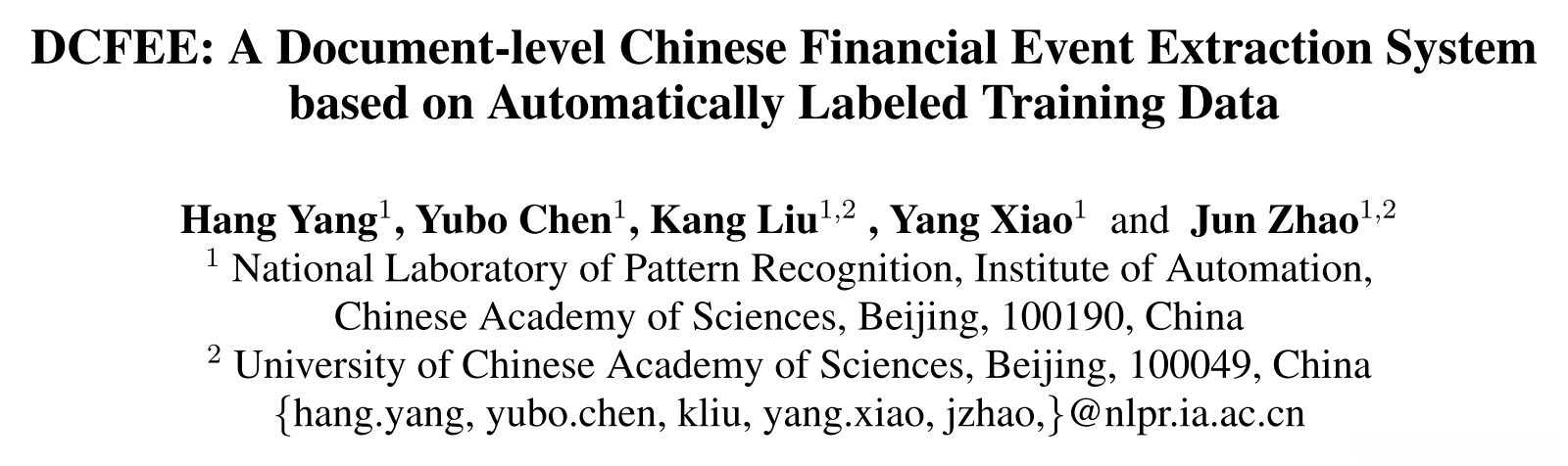 - 构建DCFEE框架模型, 该模型具备自动生成高质量标注数据的能力, 并且能够从金融公告文本中提取具有文档级别的关键事件信息.