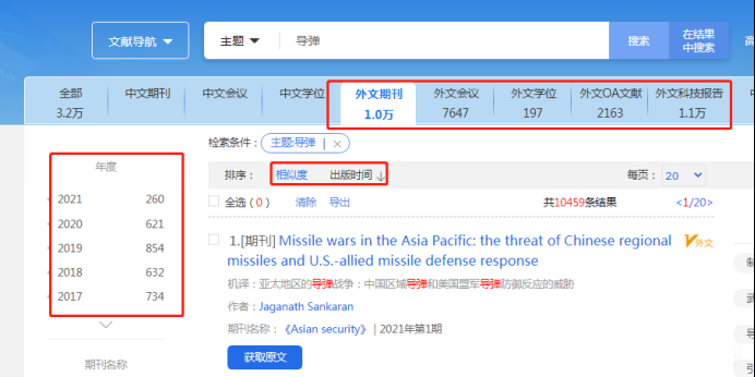(3)例如搜索"导弹"后完成查询后系统会呈现一个导航界面供用户选择所需资源类别同时用户还可以在右边栏目中设置时间参数学科分类以及筛选收录数据库等条件以满足特定研究需求此外系统还支持根据相关程度和发布日期对搜索结果进行排序以提高检索效率