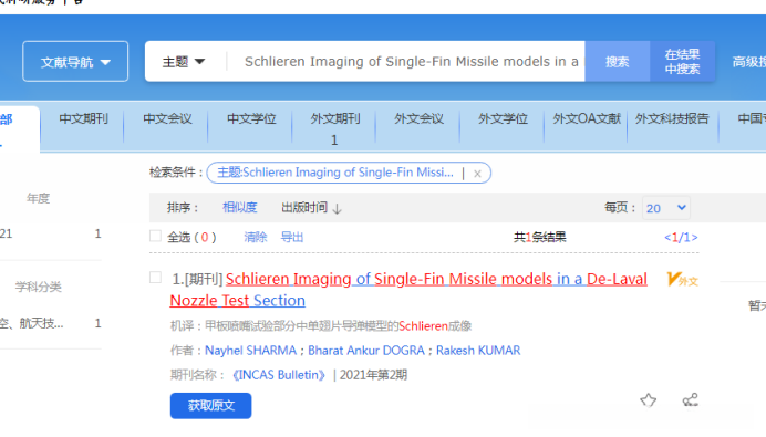 接着,在主页上执行查找操作时输入所需论文的关键信息(如主题词、文献标题或作者姓名),随后点击导航栏中的"外文期刊"选项,在其子菜单中选择目标资源;重复上述步骤依次选择"外文会议""外文学位""外文OA文献""外文科技报告"等项目后回车完成搜索