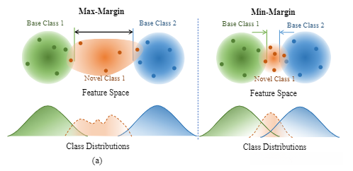在新类别及其分类与表示之间存在未识别的内在矛盾。这种矛盾体现在:为了使各类别之间保持足够的区分度,在设计两个基类别时必须确保任何两个基类间的距离都达到最大间距要求(max-margin),从而形成了新类别内部元素间的紧密联系。与此同时,在模型设计中还提出了另一个关键约束条件:即各个基类别在整体空间中尽可能靠近目标类别(min-margin),以确保能够准确地从整体空间中提取出该特定类型的典型特征特征向量,并精确描述该类别特征。如图所示
