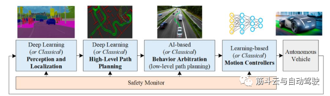 该方案可理解为“一步到位”式 ,系统从环境和定位模块获取输入后,经过一个深度学习模型,便可直接输出对车辆的控制执行命令;即从感知数据到控制执行命令的直接映射;相比传统方式省略了中间的一些过程;当然该模式也需要一个“守护者”- 安全管理器,来确保自动驾驶执行过程中每个模块的安全。