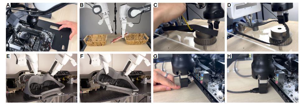 图5详细展示了通过该方法学习得到的policy在不同干扰下的稳定性分析。(a) 在外部干扰下插入ram以模拟移动主板的状态。(b) 当夹具被强行打开时,在转移任务期间会尝试重新执行操作。(c-d)动态调整策略以应对正时皮带任务中的外部干扰与变形情况。(e-f)当仪表板装配过程中出现多个夹具被强行打开时,在抓取阶段 policy 会主动释放已固定物品并重新定位。(g-h)在处理usb插头插入问题时,policy 会先释放固定住的物品然后重新尝试插拔以解决接触不良的问题