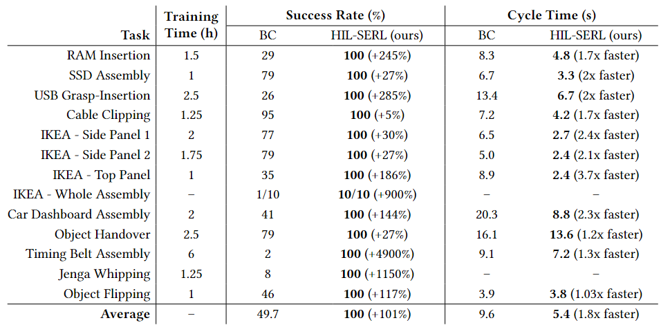 如图1所示,在我们的系统中所处理的任务包括动态翻转锅中的物体操作:从塔内取出一个方块积木,在双臂间放置物体以及组装复杂设备(如计算机主板、Ikea货架、汽车仪表盘或定时器组件),这些都需要单个或双个机械臂协同完成。这些任务在涉及高度复杂的动力学特性和高维的状态空间与动作空间方面提出了巨大挑战。其中一些技能曾被认为是在真实环境中直接运用RL进行训练所不具备的能力(例如双臂操作任务或当前机器人技术难以高效解决的任务),但近年来的研究表明:即使是在这些看似困难的任务中也能实现令人惊叹的表现——例如精确操作任务需采用反应性闭环控制策略或难以预设的精细开环行为策略(如Jenga游戏)。然而令人尤为称道的是:我们发现系统能够在几乎所有任务中成功训练出RL政策,在仅约1至2.5小时的实际训练时间内即可实现近乎完美的成功率(仅比模仿学习方法高出约101%,且循环时间提升了约1.8倍)。这一发现极为重要:因为它表明基于视觉的操作策略可以在实际训练时间内直接从真实数据中学习到广泛的人工智能技能——这是早期方法认为不可能实现的关键突破之一。此外:RL展现出超越模仿学习与手工设计控制器的能力水平