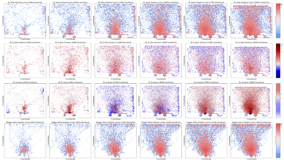 为了阐述这一过程 我们进行了深入分析 其中ram插入任务具有特殊性 因为其要求操作精确 并且在x和y方向上的对称随机化使得其易于可视化。基于末端执行器的y和z坐标 我们制作了图6中不同政策检查点在跨时间步状态访问计数上的热图。通过policy学习过程 我们发现连接初始状态与目标位置呈现出漏斗状逐渐演变的特点 当空白区域被填满时 随着接近目标区域逐渐收缩 这一现象表明policy的学习效果正在提升 其置信度与定位精度均有所增强 随后随后我们引入了‘临界状态critical states’的概念 定义为q函数方差较大的状态 使用以下公式计算该方差:$$