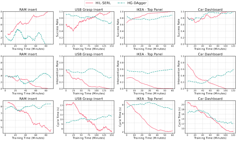 如图4所示:实验任务的学习曲线。该图分别展示了hil-serl和dagger在少数代表性任务中的成功率、周期时间和干预率(均为20次发作的连续平均值)。对于hil-serl,在整个训练过程中其成功率迅速上升到100%,同时其干预率和周期时间逐渐下降并稳定在0%。而对于hg dagger来说,其成功率在整个训练过程中呈现波动性变化趋势,并不一定随着训练的深入而持续增加。值得注意的是,在此研究中由于干预措施的频繁实施导致了成功结果的真实policy的成功率可能低于所展示的曲线值。此外,在后续的时间里干预率并未持续降低的趋势表明policy未能稳步改进这一点也体现在循环时间上即循环时间没有得到改善因为dagger缺乏在提供的训练数据之外提升性能的有效机制。补充材料中提供了其他地块的数据供进一步分析参考