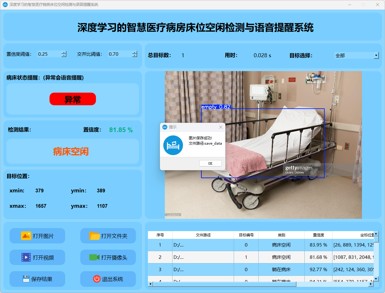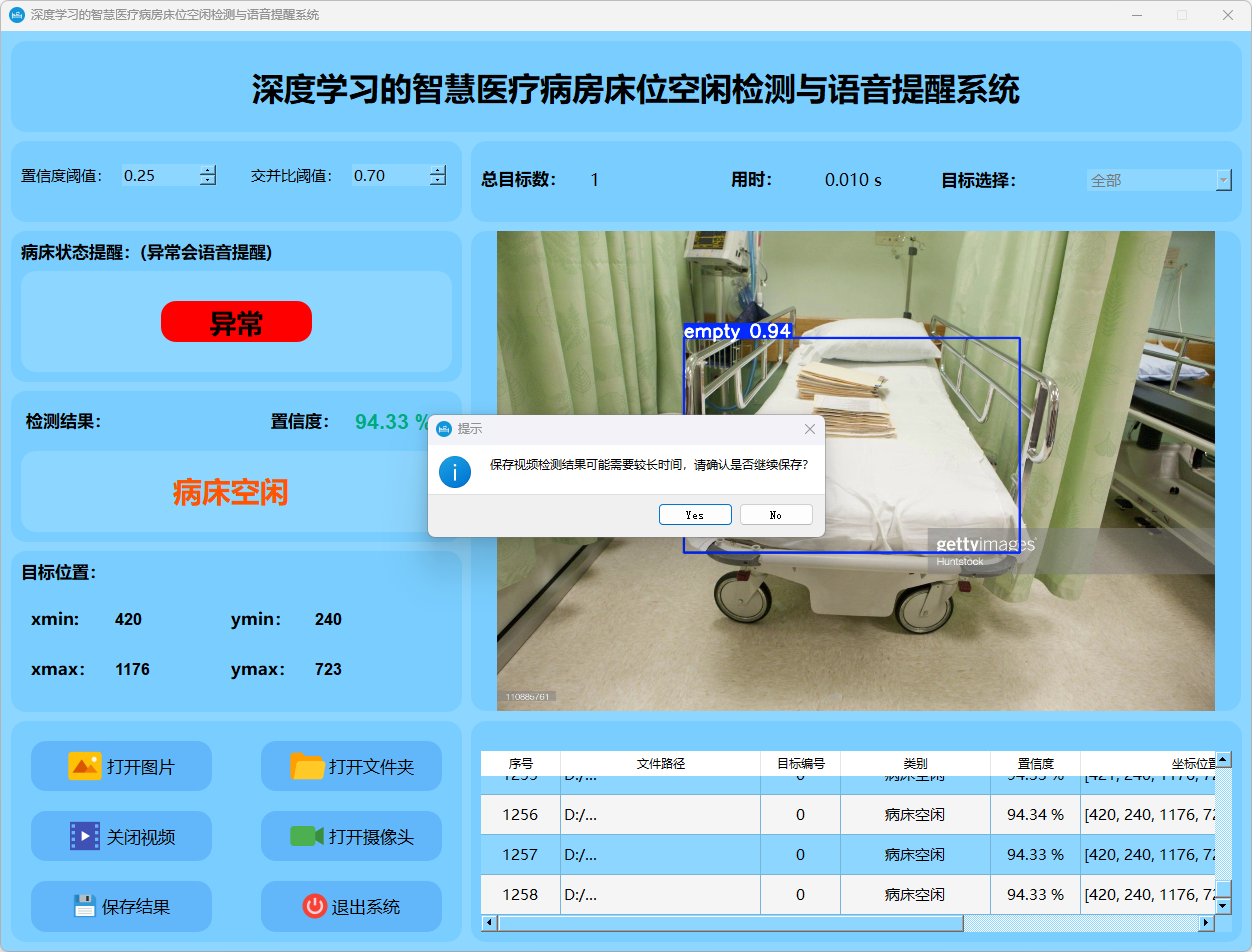 检测结果:系统对视频进行实时分析,检测到病房病床检测结果。表格显示了视频中多个检测结果的置信度和位置信息。