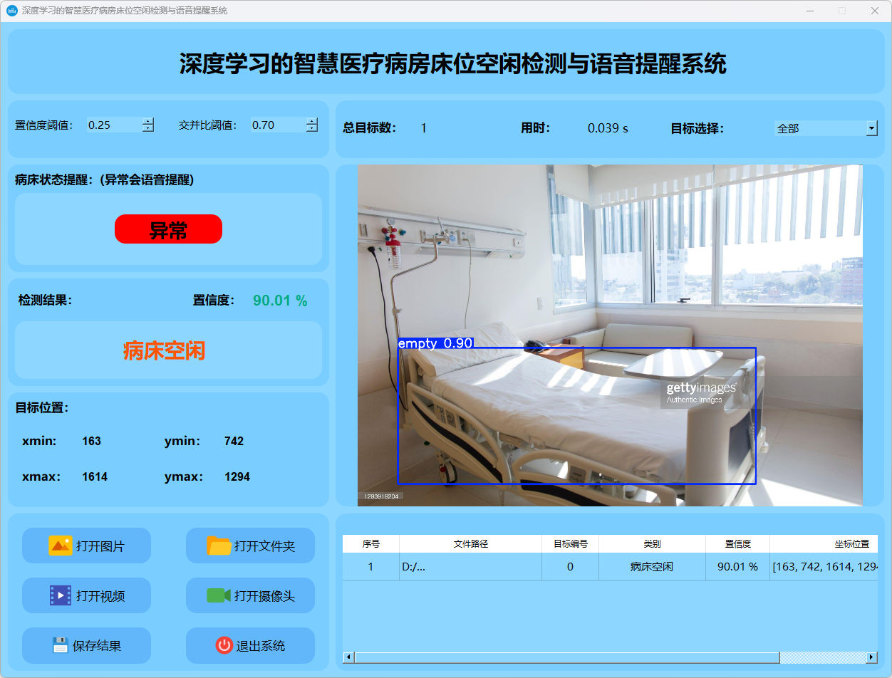 (1)当前选中的结果为 “病床空闲”,表示系统正在高亮显示检测到的“empty”。