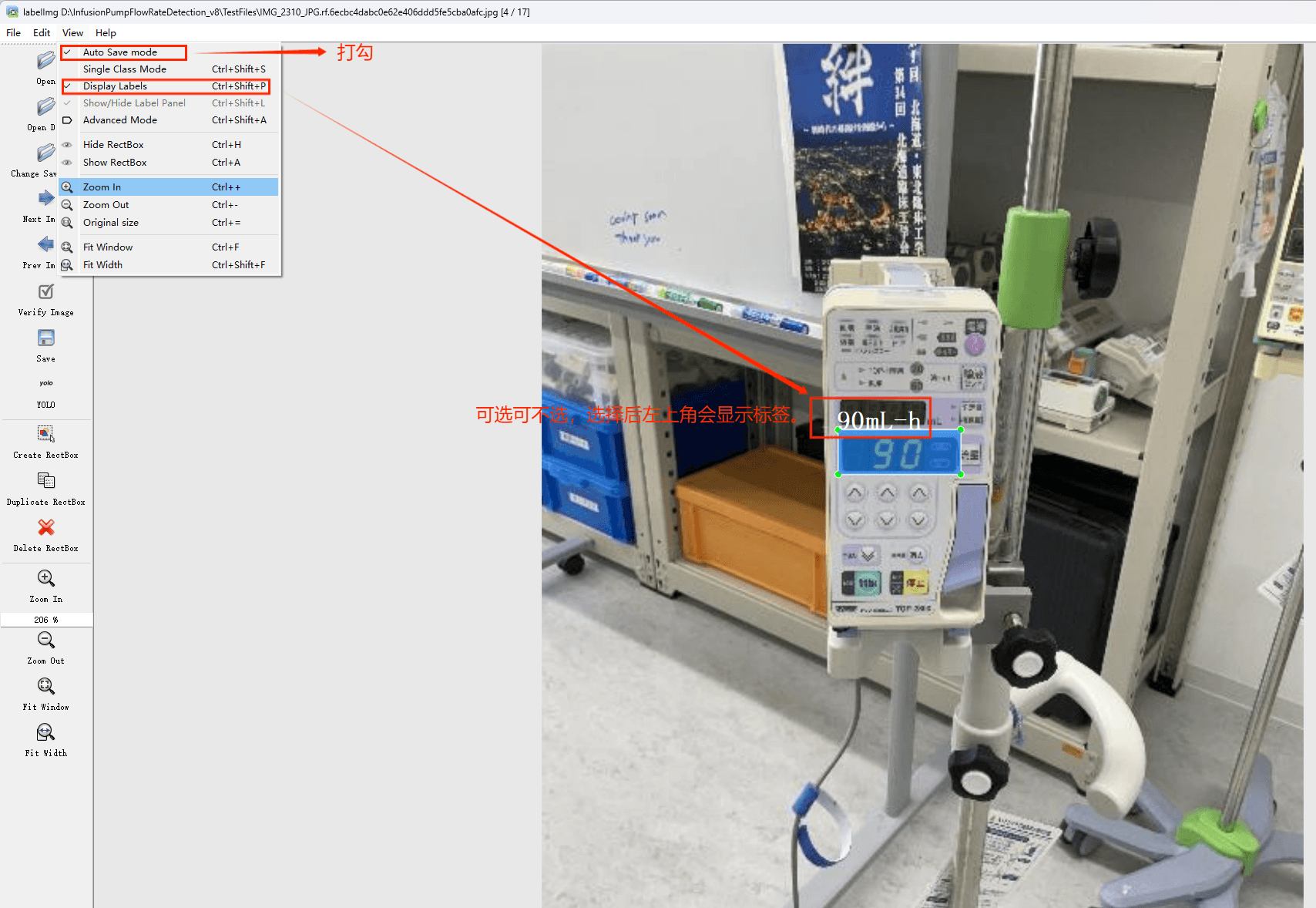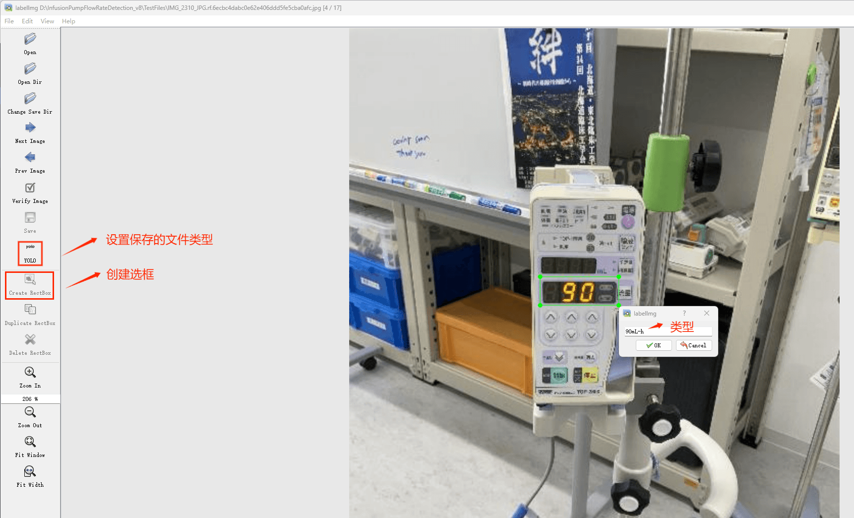 Tipps:通过搜集关于数据集为各种各样的输液泵流速相关图像,并使用Labelimg标注工具对每张图片进行标注,分2检测类别,分别是’输液泵流速过高’,’输液泵流速正常’。