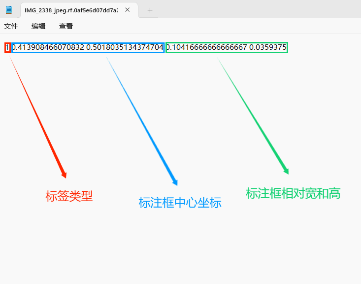 每一行代表标注的一个目标,通常包括五个数据,从左到右依次为:类别id、x_center、y_center、width、height。