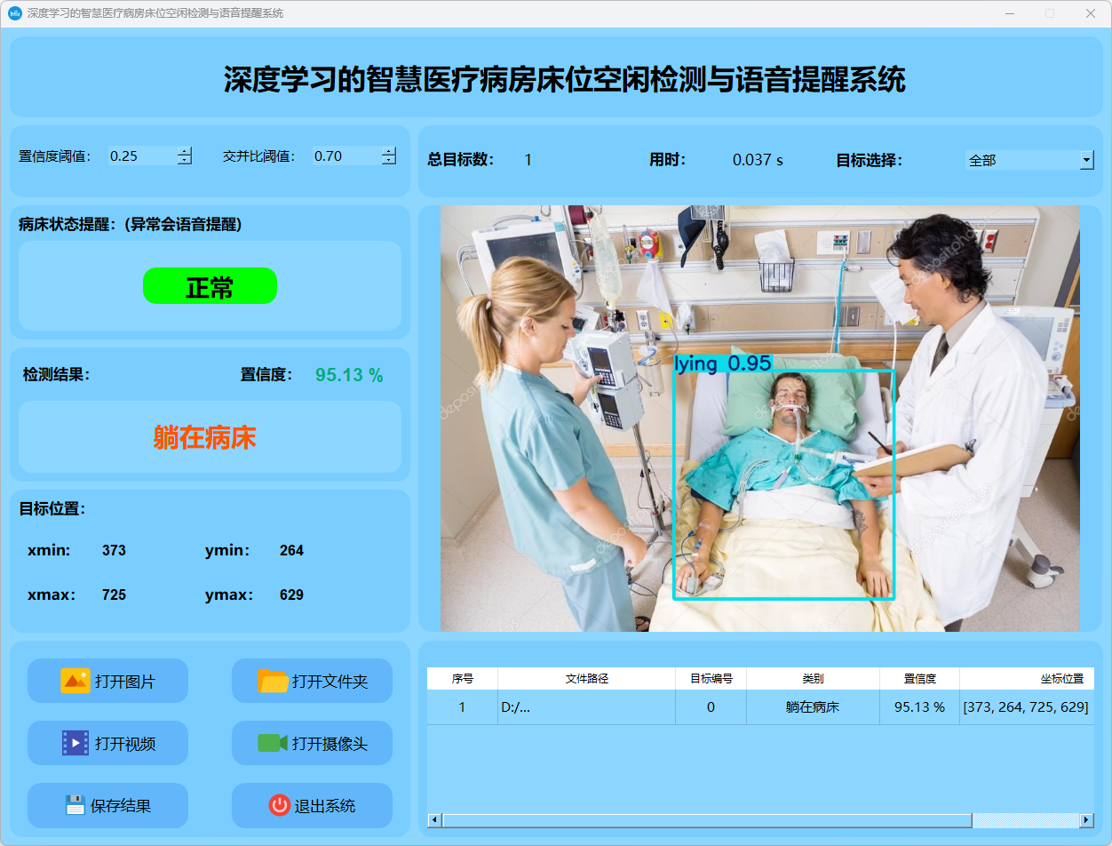 检测结果:系统识别出图片中的病房病床情况,并显示检测结果,包括总目标数、用时、目标类型、置信度、以及目标的位置坐标信息。