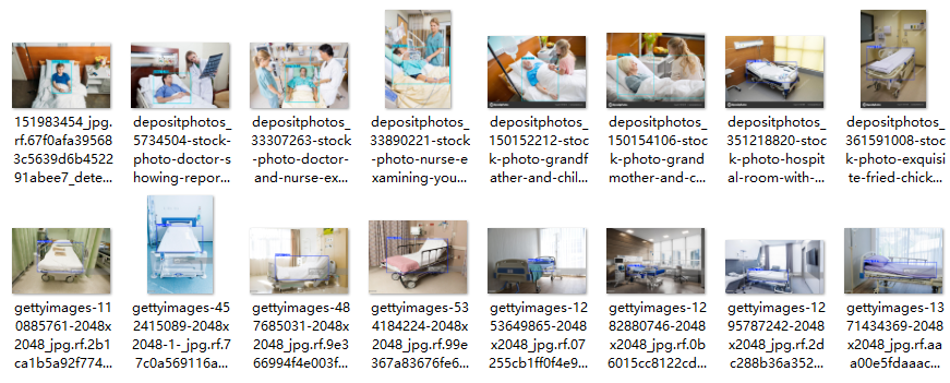 本研究使用了包含病房床位的数据集,并通过 Labelimg 标注工具对每张图像中的目标边界框(Bounding Box)及其类别进行标注。基于此数据集,采用 YOLOv8n 模型进行训练。训练完成后,对模型在验证集上的表现进行了全面的性能评估与对比分析。整个模型训练与评估流程包括以下步骤:数据集准备、模型训练、模型评估。本次标注的目标类别主要集中于病房床位。数据集总计包含 953 张图像,具体分布如下: