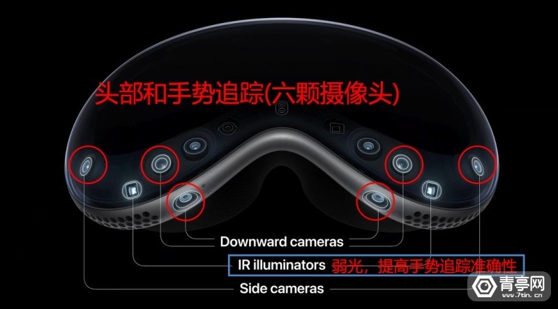 Vision Pro配备了6个集成SLAM与手势识别的摄像头。其中包含两组向下配置的摄像头专门用于捕捉手掌放置于腿部的角度;此外,在这两组镜头的基础上还增加了斜向布置的双功能镜头。为进一步提升在光线不足环境下的手势识别精度与可靠性,在Vision Pro中采用了两枚红外LED光源作为辅助传感器。