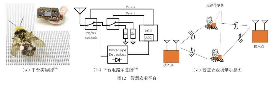 研究者在文献[36]中构建了一个昆虫物联网平台,并对其实物部分及电路原理图进行了详细标注(如图12a和图12b)。该平台采用了无源式传感器技术,在活体昆虫表面进行安装以采集信息。通过反向散射技术实现传感器与固定站点之间的通信机制。智慧农业场景的具体信息获取途径如图12c所示,在该场景下配备了水分、温湿度、光照等多种类型的传感器装置。这些装置能够采集作物生长环境数据、授粉状态监测数据等关键参数,并通过无线传输模块将实时信号传递至固定站点进行分析处理。基于分析结果系统会自动制定最优控制方案并发送指令指示操作人员进行精准调节