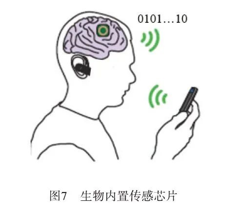 内置于生物体内的生物芯片能够通过外部射频技术进行信号传输。如图7所示 ,该装置能够从大脑获取相关数据后,在智能手机端完成这些数据的接收与处理。智能手机接收这些信号后进行分析处理,并还原出大脑的信息内容。