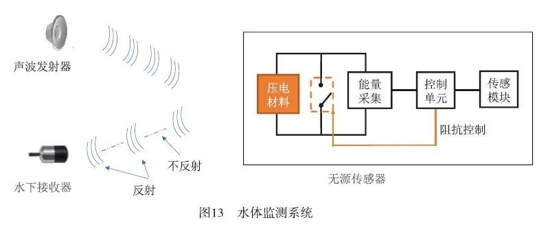 文献[38]通过无源标签应用压电材料实现了水下环境中的反向散射通信。如图13所示 ,在水下布置了带有温湿度传感器和pH传感器等多种功能的无源探测设备。该系统能够采集环境参数,并借助反向散射技术将数据传输至终端设备。这种设计实现了低能耗且易于布置的环境监测方案。