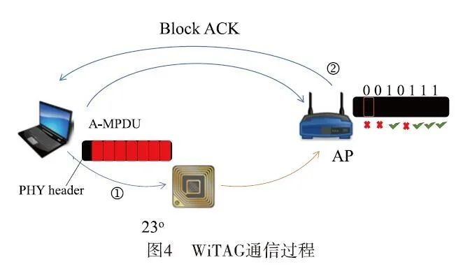 文献[33]基于Wi-Fi信号MAC层的帧聚合(A-MPDU)特性实现了反向散射通信的技术方案。如图4所示的是该通信过程的具体实施情况。无源设备根据需要加载的数据信息发送反向散射信号,并动态调整子帧(MPDU)传输过程中的信道使用情况。由于每个A-MPDU传输阶段仅进行一次信道估计操作,在此过程中接入点(AP)无法恢复受干扰的MPDU数据包;此时AP返回的表示MPDU是否被恢复的ACK信息即为无源设备需要发送的关键数据信息。