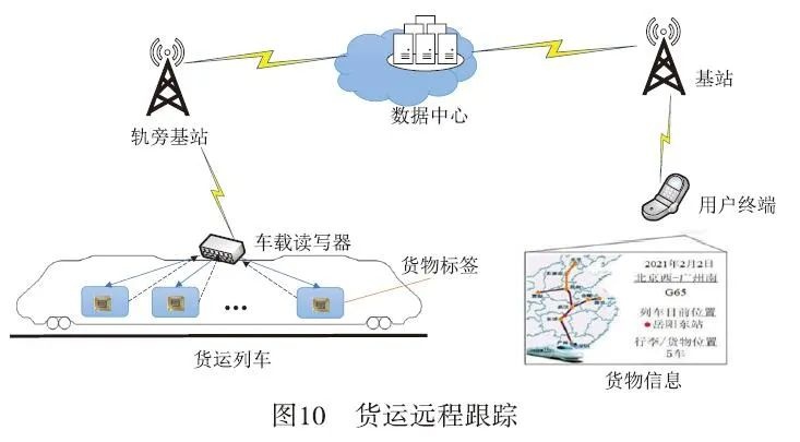 (3)货运实时远程跟踪。列车货运场景如图10所示**[link]** ,货物被无源标签覆盖后,在车厢内的阅读器定期更新并刷新货物信息记录;车内阅读器借助列车无线网络以及铁路货运网络实现信息交互;发货人及接收方可通过手机APP或网页平台获取货物实时位置与状态等详细信息。