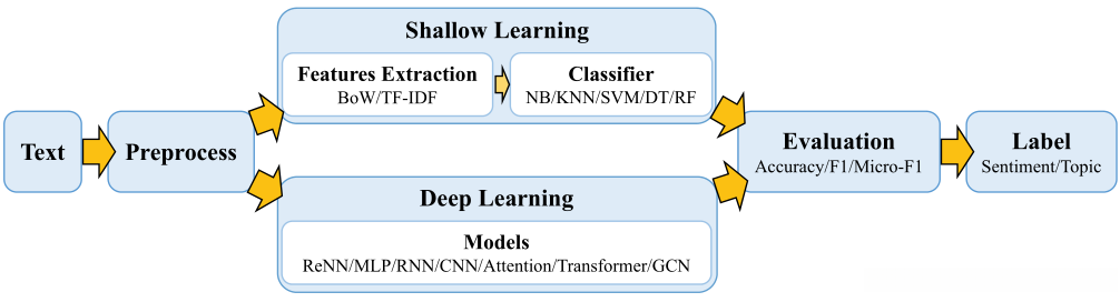 (一)浅学习模型步骤:在预处理阶段中对原始输入文本进行了处理,并通过这一过程实现对浅学习模型的训练工作;该过程通常包含分词操作、数据清洗以及统计数据特征等环节;最终其表示结果被分类器用来进行分析或判断。