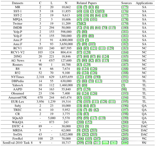 **数据集的汇总统计C:目标类别数量****L:平均句子长度N:**数据集大小