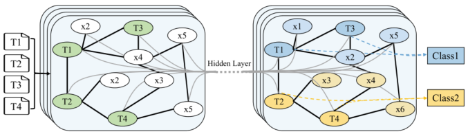 图注意力网络(GATs)利用其邻居信息以实现隐含自注意力机制。由此导出了一系列基于GAT的方法用于生成各节点的潜在表示。带有多重注意力机制的异构图注意力网络(HGAT)旨在识别当前节点的不同邻接节点及其类型。该模型通过在网络传播信息并捕捉关系模式来应对半监督短文本分类中的语义稀疏性问题。MAGNET则利用GATs捕捉标签间的关联关系,并根据特征矩阵与相关矩阵构建分类器模型。