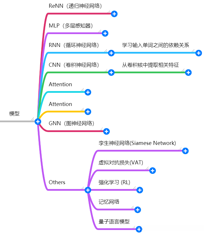 图注意力网络(GATs)通过关注其邻居来利用隐式的自我注意力机制。从而发展出了一系列基于GAT的模型用于生成节点的隐式表示。带有多重注意力机制的异构图注意力网络(HGAT)致力于学习当前节点的不同邻居及其类型间的相对重要性。该模型通过在图上传播信息并捕获关系结构来缓解半监督下短文本分类中的语义稀疏性问题。MAGNET则基于GATs捕获标签间的关联性,并通过构建特征矩阵与相关矩阵来训练分类器。