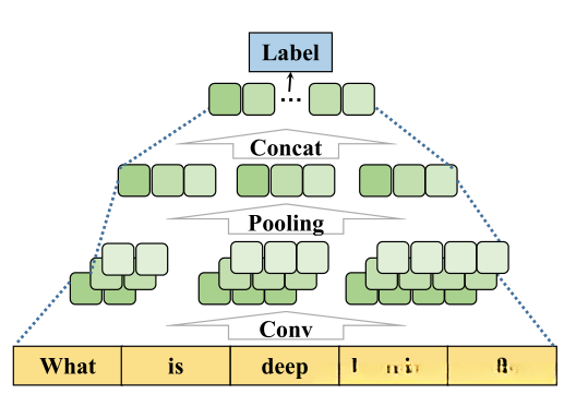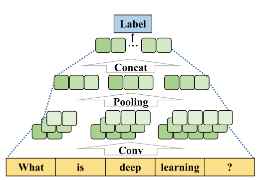 4)CNN:首先, 将输入文本的所有词向量进行拼接形成一个矩阵. 接着将此矩阵输入到卷积层中, 该卷积层包含了多个不同维度的滤波器. 最后, 其输出结果随后经过池化操作, 并对各池化区域的最大值进行合并, 得到文本的整体特征表示. 最终特征通过全连接层完成分类任务. TextCNN架构通过单个卷积核能够更加有效地识别出max-pooling区域内的关键短语, 同时保持词嵌入在外 trained的同时学习其他超参数.