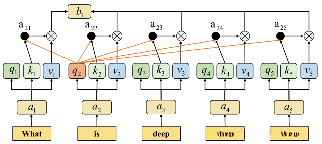 Self-attention通过生成查询(Query)、键(Key)和值(Value)矩阵,在句子中定位每个单词的重要性分布,并捕获文本分类所需的长程依赖关系。每个输入词向量ai被分解为三个n维向量qi、ki和vi,并经过自注意力机制处理后得到输出向量ai。