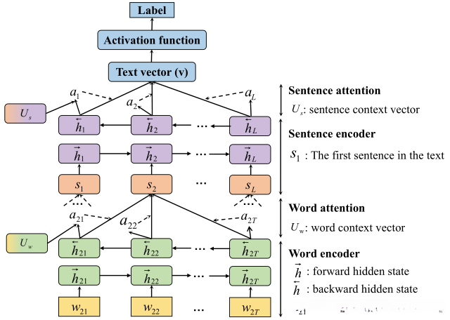 层次化注意力网络(HAN)通过深度学习框架实现了复杂语义关系建模功能如图11所示其架构包含两个编码器模块与多层次注意力机制注意力机制赋予模型对不同输入赋予不同关注程度随后将原始词汇映射至统一维度空间中生成句嵌表示接着整合各子句嵌表达形成文档级别语义表示双层注意力机制能够有效区分各单词与短语在语义表征中的重要性这种多级化处理方式不仅提升了模型识别能力还能准确定位关键信息有助于准确评估其对分类任务的关键性