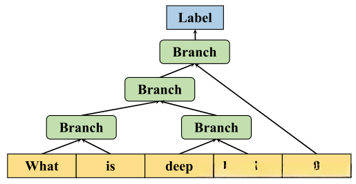 ReNN是一种序列神经网络架构,在其模型结构中,默认情况下会将输入文本中的每一个单词设定为模型结构中的叶子单元。随后通过加权矩阵将这些叶子单元组合成内部父单元,并且这些加权关系在整个网络架构中被共享使用。每一个内部单元都与原始输入单元保持一致的特征维度。最终系统会将整个序列的所有特征逐步汇聚到一个最终向量上,并基于此进行分类或回归任务。