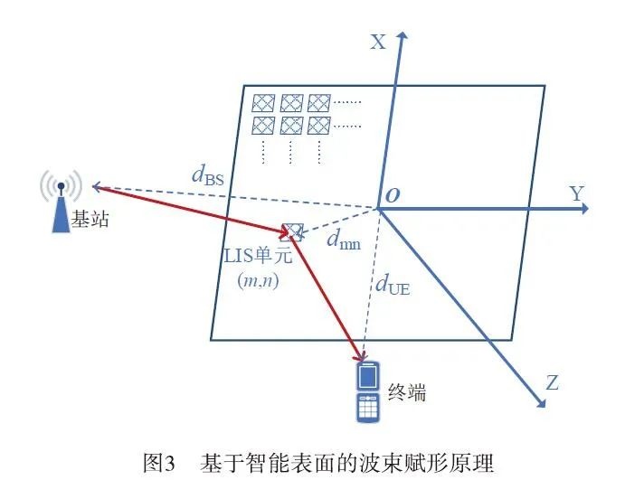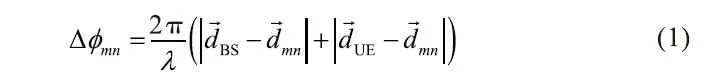 分别以基站、终端以及器件单元(m, n)的坐标向量为基础。当终端与智能表面之间的相对位置满足远场辐射条件时,智能表面发送至终端的信号可近似为平行信号。此时,基站与智能表面之间的信号传输同样可进行相应的近似处理。