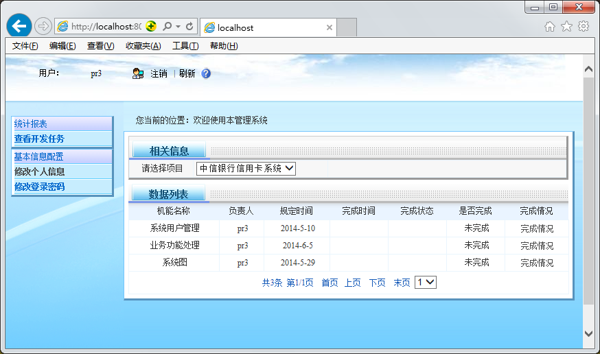 本系统为项目管理系统,是以java为开发语言,系统采用B/S架构来设计,使用MVC 编程模式,采用Jsp作为视图层,显示页面信息,用myeclipse作为开发工具,以MYSQL作为数据库,用photoshop作为界面美化工具,页面采取JSP动态页面开发技术。系统分为四个权限用户,即系统管理员,项目经理、开发人员和测试人员。系统界面友好、操作简单,便于维护,达到充分利用信息,提高工作效率和工作质量,提高生产率的目的。