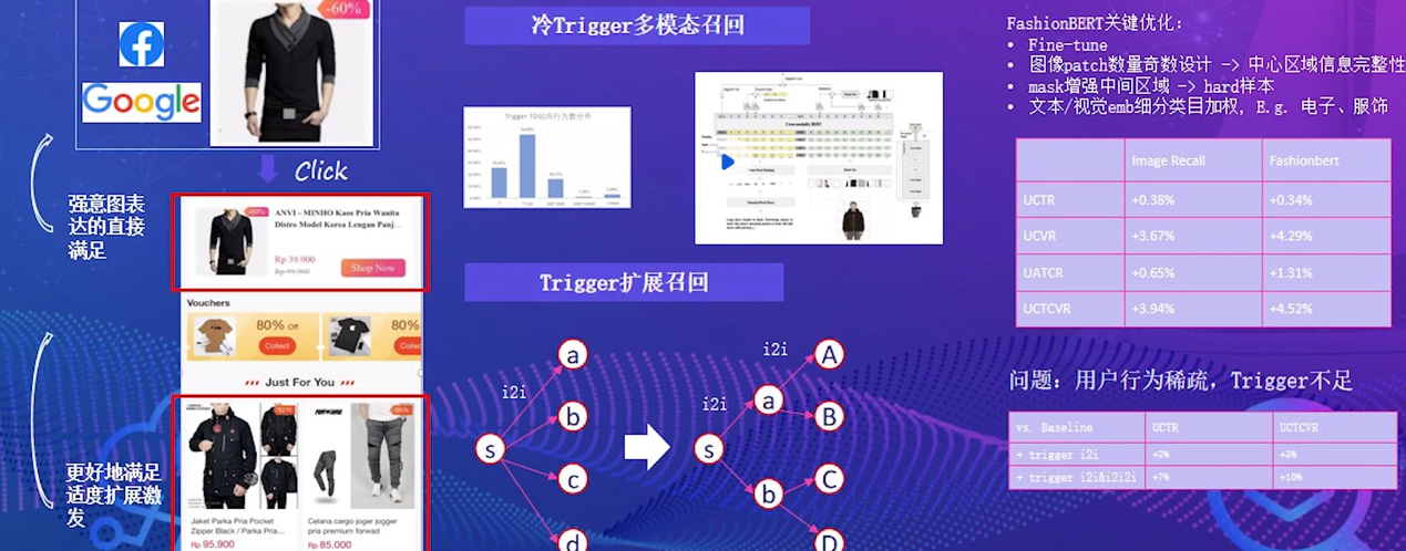 在引承一体算法的基础上,在Lazada平台中引入了多模态召回机制与意图判断功能,并采用FashionBERT模型作为核心支撑技术,在用户体验方面实现了对新增用户的精准引导与服务支持。具体而言,在平台入口处为新增用户提供个性化的服务支持,并引导其完成需求满足及最终转化目标(即成为有效留存流量)。针对稀疏行为用户的个性化推荐问题,在这一过程中开发了HIM混合兴趣模型,并通过聚类兴趣表达来弥补个性化特征表达能力的不足。这种创新性设计不仅有效提升了平台在特殊用户场景下的运营效能(同时兼顾UCT/CVR指标和Buyer指标)