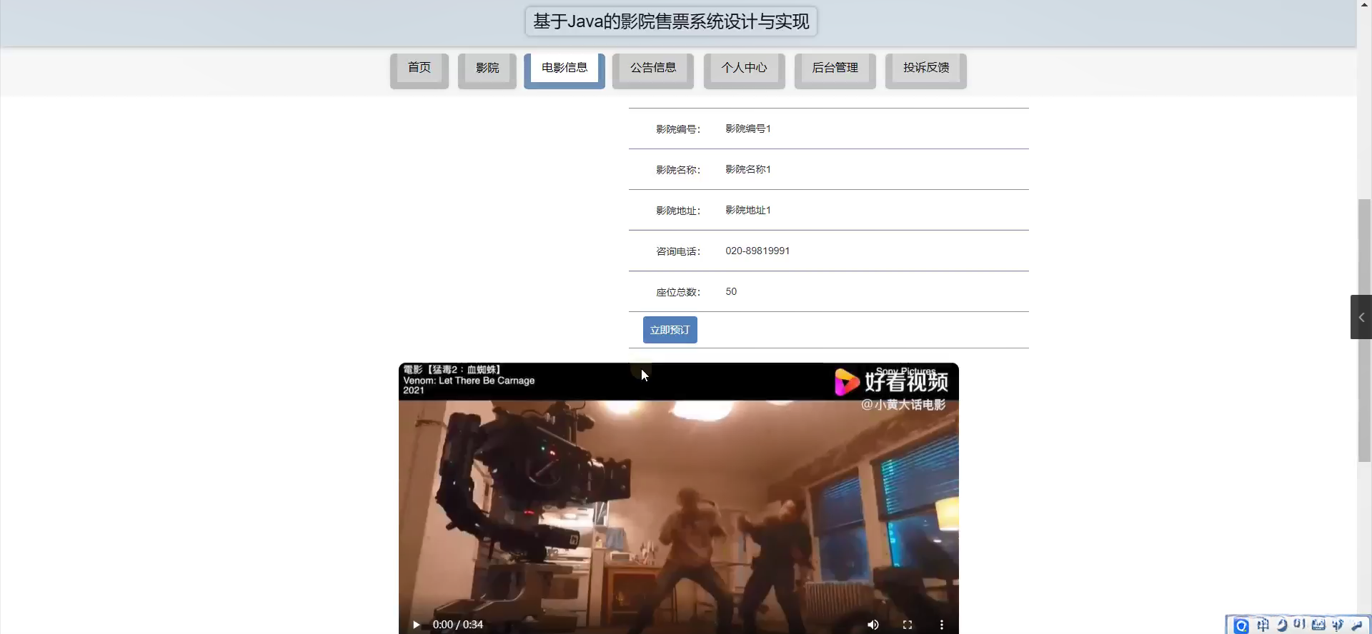 - 票务预约服务:支持用户在线预约指定场次的电影票并选择合适的观影时间。