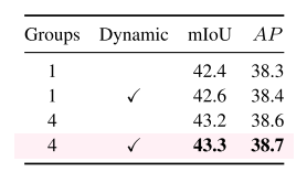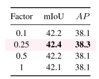 根据表3,动态范围系数进一步将性能提升至38.7(+0.1)AP和43.3(+0.1)MIU.