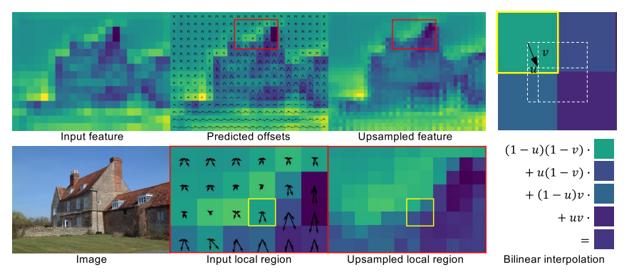 如何工作DySample的采样过程如图9所示。我们突出显示一个(红色方框)局部区域,以显示DySample如何将边缘上的一个点分割为四个点,以使边缘更清晰。对于黄色盒子的点,它生成四个偏移量,指向双线性插值法意义上的四个上采样点。在这个例子中,左上角的点被划分为“天空”(较亮),而其他三个点被划分为“房子”(较暗)。最右侧的子图表示右下角的上采样点是如何形成的。