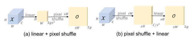 图6.偏移生成样式。虽然(A)‘线性层+像素重组’(LP)版本比(B)‘像素重组+线性层’(PL)版本需要更多的参数,但前者更灵活,消耗更小的内存占用,并且具有更快的推理速度。