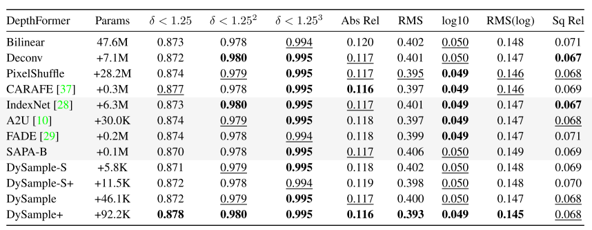 在所有上采样器中,DySample+的性能最好,与双线性上采样器相比,δ<;1.25的精度提高了0.05%,Abs REL降低了0.04%,均方根值降低了0.09%。此外,图9第5行中的定性比较也验证了DySample的优越性,例如,准确、一致的椅子深度图。
