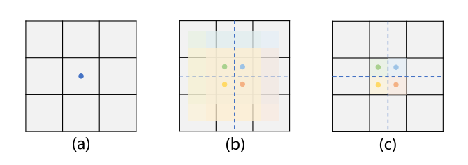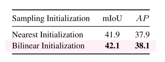 在初步版本中,S2采样位置w.r.t.X中的一个点都固定在相同的初始位置(X中的标准网格点),如图3(A)所示。这种做法忽略了S2邻近点之间的位置关系,使得初始采样位置分布不均匀。如果生成的偏移量全为零,则上采样特征等价于NN内插特征。因此,这种初步的初始化可以被称为最近的初始化。针对这个问题,我们将初始位置改为如图3(B)所示的“双线性初始化”,其中零偏移将带来双线性早期内插特征映射。更改初始采样位置后,性能提高到38.1(+0.2)ap和42.1(+0.2)miou,如表1所示。