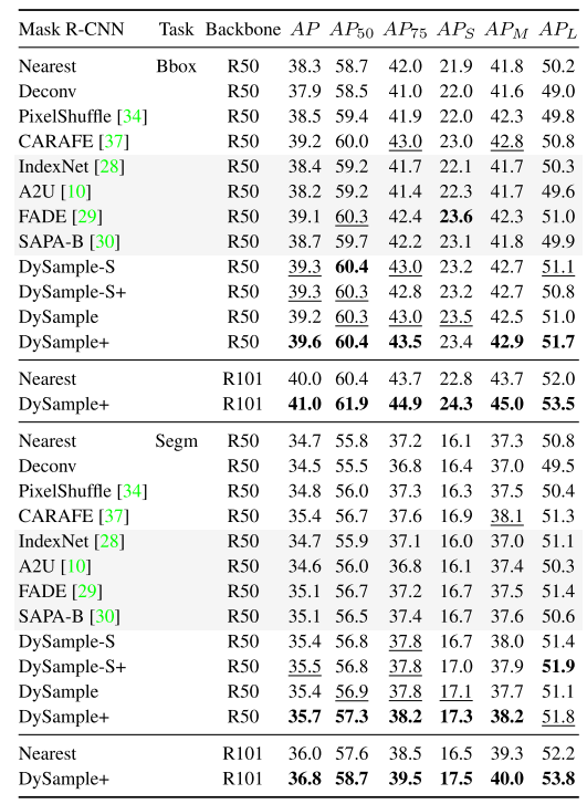 表6和表7显示了定量结果。结果表明DySample优于所有比较的上采样器。使用R50,DySample在所有测试的上采样器中实现了最好的性能。当使用更强大的主干时,也可以看到显著的改善(在更快的R-CNN上R50+1.2与R101+1.1盒AP,在MASK R-CNN上R50+1.0与R101+0.8掩码AP)。