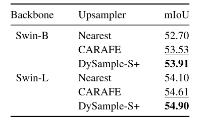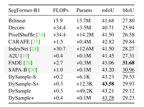表4和表5显示了量化结果。我们可以看到DySample在SegFormer-B1上达到了43.58的最佳Mou度量,但Biou度量低于Fade和SAPA等引导上采样器。因此,我们可以推断DySample主要从内部区域改善性能,而导引上采样器主要改善边界质量。如图9第1行所示,DySample的输出与Carafe相似,但在边界附近更独特;引导上采样器预测更清晰的边界,但对内部区域的预测是错误的。对于更强的基线MaskFormer,DySample还使用Swin-B将MIU度量从52.70提高到53.91(+1.21),使用Swin-L从54.10提高到54.90(+0.80)。