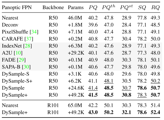 表8中显示的定量结果表明,DySample带来了一致的性能提升,即R50和R101主干的PQ分别提高了1.2和0.8PQ。