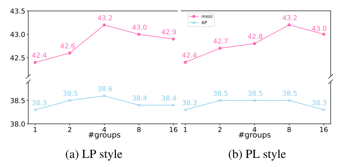 在上面的设计中,首先使用线性投影来生成S2偏移集。然后对集合进行重塑以满足空间大小。我们把这个过程称为‘线性+像素重组’(LP)。为了节省参数和GFLOP,我们可以提前执行重塑操作,即首先将特征X重塑到Cs2×sh×Sw的大小,然后将其线性投影到2g×sh×Sw。类似地,我们称这个过程为‘像素重组+线性’(PL)。在其他超级参数固定的情况下,在PL设置下,参数的数量可以减少到1/S4。通过实验,我们根据图5经验地分别将LP和PL版本的基团数设置为4和8。此外,我们发现PL版本在SegFormer(表4)和MaskFormer(表5)上的性能优于LP版本,但在其他测试模型上略差。