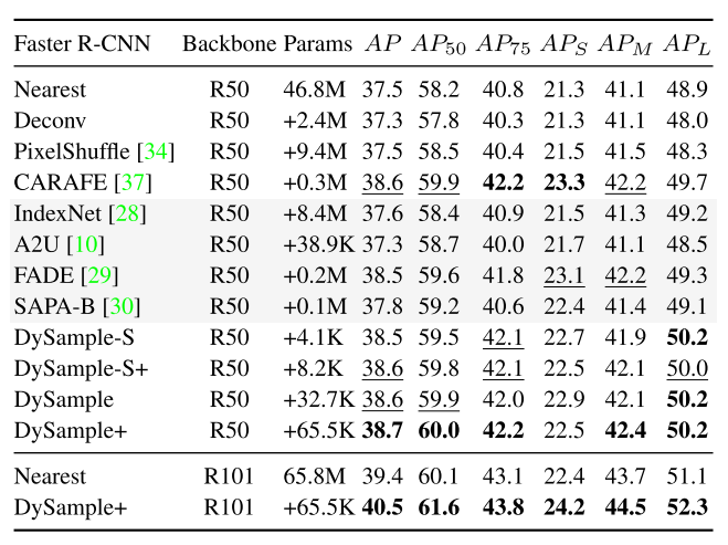 在这里,我们将DySample与Carafe[37]、SAPA[30]和Deformable Attendant[44]进行比较。