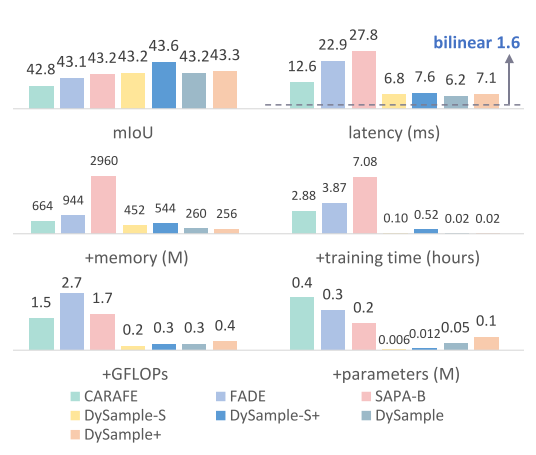图8.复杂性分析。DySample系列在SegFormer-B1[40]上实现了整体最好的性能,并且在最近的强动态上采样器中耗费的延迟、内存占用、训练时间、GFLOP和参数数量最少。通过在服务器上使用单个NVIDIA GTX 3090图形处理器对256×120×120特征地图(如果需要,还包括256×240×240引导特征)进行上采样来测试推断时间。‘+’表示与双线性插值法相比的附加量。