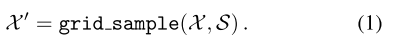 给定大小为C×H1×W1的特征地图X和大小为2×H2×W2的采样集S,其中第一维的2表示x和y坐标,网格采样函数使用S中的位置将假设的双线性内插的X重新采样为大小为C×H2×W2的X‘。此过程由以下定义。
