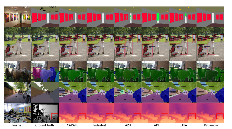 在这里,我们将DySample应用于五个密集预测任务,包括语义分割、目标检测、实例分割、全景分割和深度估计。在众多的上采样竞争者中,对于双线性插值,我们将缩放因子设置为2,并将“对齐角落”设置为False。对于反卷积,我们设置卷积核大小为3,步长为2,填充为1,输出填充也为1。对于像素重组 [34],我们首先使用3个卷积核大小的卷积来增加通道数,使其变为原来的4倍,然后应用“Pixel Shuffle”函数。对于CARAFE [37],我们采用其默认设置。此外,我们还使用了IndexNet的“HIN”版本[28]和A2U的“dynamic-cs-d†”版本[10]。我们选择不使用门控机制的FADE [29]和SAPA-B [30],因为它们在所有密集预测任务中表现更为稳定。