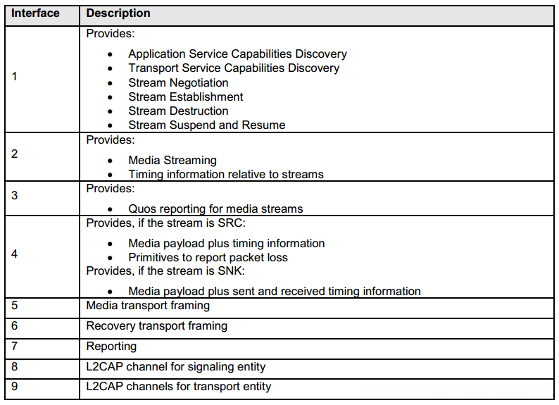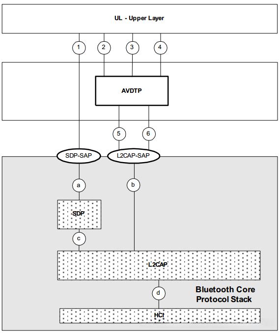 AVDTP在协议栈上的结构:向上层提供了三个接口,向下层提供了2个接口