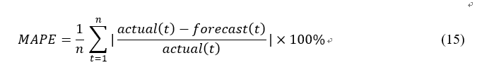 MAPE 是 MAD 的变体形式,在其表示一种比率时便具备了易于理解的特点。当 MAPE 值为 5 时,则意味着预测结果与实际数值之间存在平均偏差的 5%水平。该指标的计算方法如下:MAPE 被用来衡量测试集上平均测试值与真实值之间的相对误差大小。具体而言,MAPE 被定义为