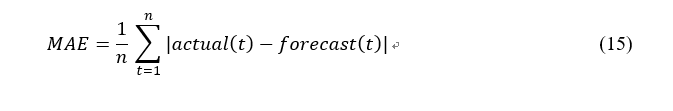 MAE 的数值越小,则表明预测模型的精确度更高。MAE被用来衡量实验数据集上预测值与真实值之间的平均绝对误差。对于包含n条微博的小测验集而言,在测试集中计算得到的平均绝对误差即为MAE: