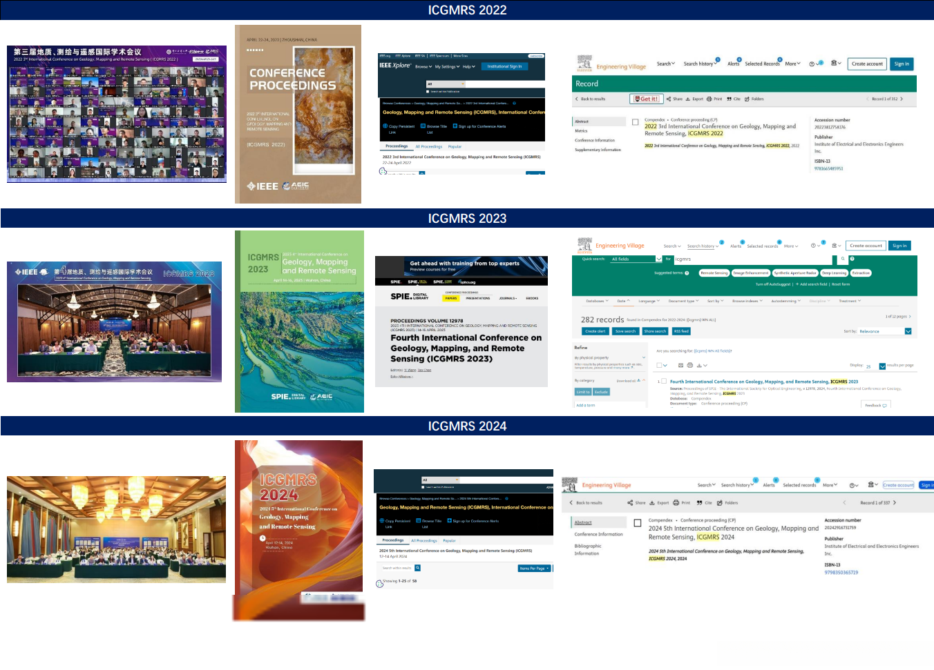 地质、测绘与遥感国际学术会议(ICGMRS)自2020年起已成功举办四届,2024年第五届地质、测绘与遥感国际学术会议(ICGMRS 2024)由中国地质大学主办,于 2024 年 4 月 12-14 日成功举办。2023 年第四届地质、测绘与遥感国际学术会议(ICGMRS 2023)由中国地质大学主办,北京邮电大学、苏州科技大学(地理科学与地球信息工程学院)、湖北工业大学、电子科技大学(中国)和大诺伊达理工学院(印度)协办。 2022 第三届地质、测绘与遥感国际学术会议(ICGMRS 2022)由舟山市人民政府、中国遥感应用协会、浙江省地理学会指导,浙江海洋大学主办。会议报告内容和参会人员体现了研究领域齐全、学术交流顺畅、学科交叉充分、青年人才辈出的四大特点,预示着我国地学、测绘遥感与海洋通信事业的蓬勃发展和美好未来。